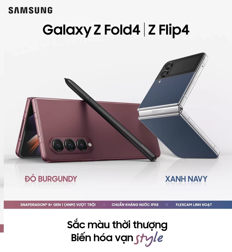 Hai phiên bản màu mới Galaxy Z Fold4 Đỏ Burgundy và Galaxy Z Flip4 Xanh Navy đã được Công ty Điện tử Samsung Vina mở bán tại các hệ thống