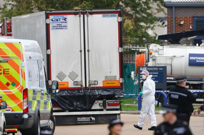 Chiếc xe container đông lạnh với 39 nạn nhân đông cứng được nhà chức trách Anh phát hiện sáng 23-10-2019 tại Hạt Essex.