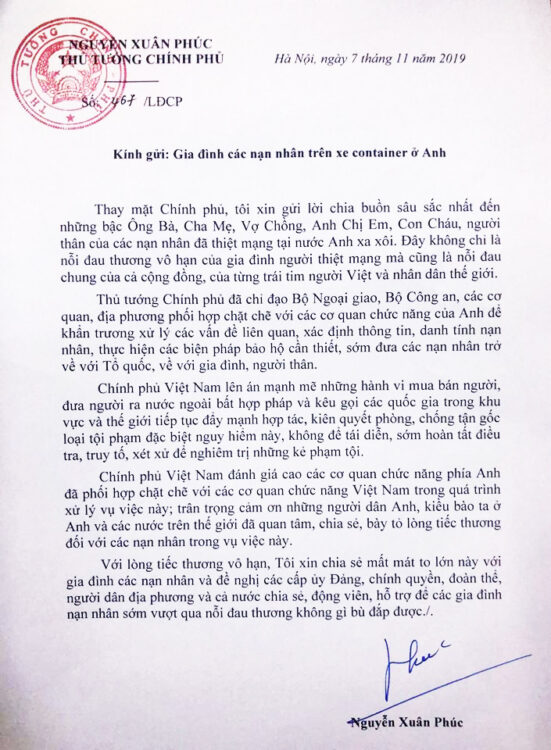 Thủ tướng Nguyễn Xuân Phúc tối 7-11-2019 cũng đã gửi thư chia buồn tới các gia đình nạn nhân: