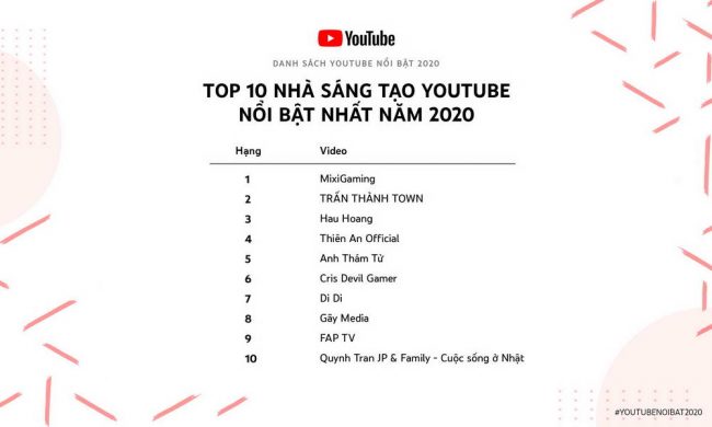 Năm nay, bên cạnh hai bảng xếp hạng video truyền thống, YouTube cũng công bố danh sách Top 10 Nhà Sáng tạo YouTube Nổi bật nhất năm 2020 dựa trên mức độ tăng trưởng của các kênh.