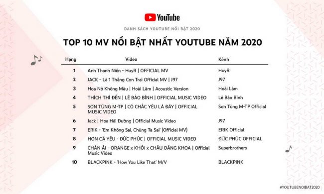 Bảng xếp hạng năm 2020 đánh dấu sự trở lại ngoạn mục của HuyR với Anh Thanh Niên sau hai năm vắng bóng. Năm 2018, HuyR cũng từng góp mặt tại danh sách này với Cô Gái m52. Lê Bảo Bình, hiện tượng âm nhạc mới nổi lên trong năm vừa qua trên mạng xã hội, ghi dấu sự thành công của mình trong năm qua với MV Thích Thì Đến nằm trong Top 10 Top 10 MV Nổi bật nhất YouTube, đánh bật nhiều cái tên nổi tiếng.