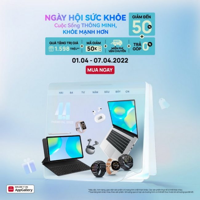Từ nay đến hết ngày 7-4-2022, nhân ngày Sức khỏe Thế giới (World Health Day) 7-4, Huawei Việt Nam tiến hành chương trình khuyến mại đặc biệt, giảm giá đến 50%; tặng quà trị giá 1,5 triệu đồng; miễn phí vận chuyển và trả góp 0% cho các sản phẩm âm thanh và đồng hồ thông minh.