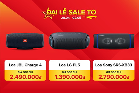 Các thiết bị âm thanh bao gồm loa Bluetooth, tai nghe không dây được bán với mức giá sốc, giảm giá lên đến 60%. Cụ thể như loa Bluetooth JBL CHARGE 4 được bán với giá 2,49 triệu đồng; loa di động Bluetooth LG XBOOMGO PL5 có giá bán 1,39 triệu đồng; tai nghe không dây JBL Live300 TWS Đen có giá bán chỉ 1,99 triệu đồng.