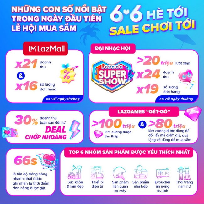 - Đại nhạc hội Lazada SuperShow 6.6 bùng nổ với hơn 20 triệu lượt xem trên khắp các kênh mạng xã hội. Doanh thu ghi nhận xuyên suốt chương trình tăng gấp 24 lần và số lượng đơn hàng tăng gấp 19 lần so với ngày thường.