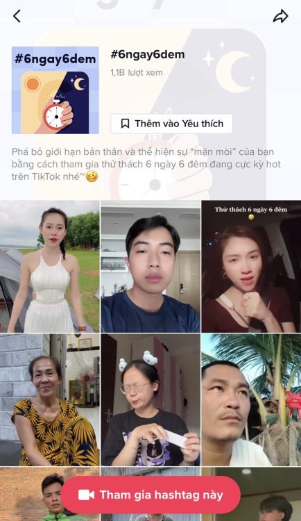 Vừa qua, cộng đồng TikTok được dịp “cười ra nước mắt” với hàng loạt thử thách hài hước và độc lạ thông qua hashtag #6Ngay6Dem. Xuất phát từ những video thử thách đậm chất thôn quê, câu nói “6 ngày 6 đêm… gét gô” của kênh Tới Trời Thần (@toi69n1), #6Ngay6Dem đã nhanh chóng gây sốt khắp nền tảng, mang về hơn 100 nghìn video tham gia sáng tạo và gần 1 tỷ lượt xem. Với nội dung đơn giản và dễ thực hiện, người dùng có thể thỏa sức sáng tạo với những thử thách khó đỡ và mang lại những màn xử lý tình huống tuy vụng về nhưng không kém phần hài hước cho người xem.