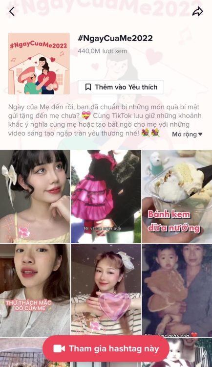Tháng 5 vừa qua đã mở ra hàng loạt hoạt động ý nghĩa, đưa người xem đi qua mọi cung bậc cảm xúc từ hài hước đến xúc động với những video tri ân Ngày của Mẹ (Mother’s Day). Hashtag #NgayCuaMe2022 đã trở thành nơi lưu giữ những khoảnh khắc đặc biệt để cộng đồng thể hiện tình yêu thương, gửi gắm những lời chúc, sự quan tâm và lòng biết ơn đối với những người làm mẹ. Thu hút hơn 100 nghìn video tham gia sáng tạo và hơn 437 triệu lượt xemtừ các thử thách như: phối đồ, trang điểm theo phong cách của mẹ hoặc tự tay vào bếp nấu ăn cho mẹ, hashtag đã góp phần lan tỏa rộng rãi những thông điệp ấm áp và giá trị tích cực đến với người dùng về tình cảm gia đình trong tháng qua.
