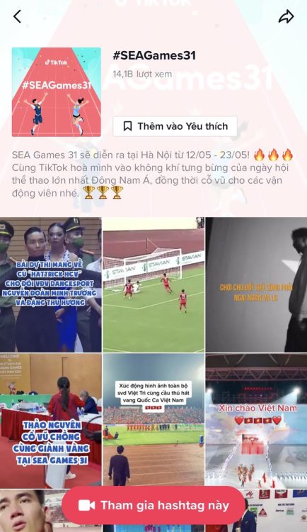 Với tư cách một đơn vị đồng hành chính thức của sự kiện thể thao lớn nhất khu vực Đông Nam Á – SEA Games 31 do Việt Nam đăng cai, TikTok đã cho ra mắt hashtag #SEAGames31 để giúp cộng đồng những người yêu thể thao được cập nhật các kiến thức, theo dõi quá trình tập luyện, tương tác và cỗ vũ cho các vận động viên đang tranh tài tại giải đấu. Sự kiện khép lại không chỉ mang đến chiến thắng áp đảo của đoàn thể thao Việt Nam, mà còn là thắng lợi khi nói về mặt truyền thông với hơn 1 triệu video tham gia và gần 14 tỷ lượt xem trên nền tảng.