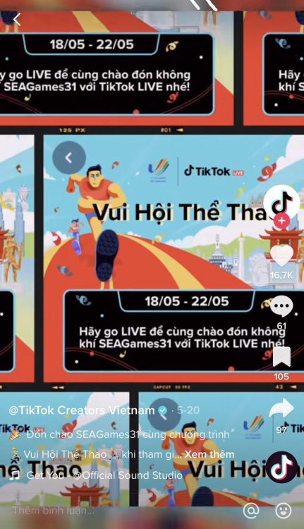 Hòa chung không khí sôi động và cuồng nhiệt của Đại hội Thể thao Đông Nam Á SEA Games 31, TikTok LIVE đã triển khai chương trình Vui hội Thể thao diễn ra từ ngày 18-5. Trong khuôn khổ chương trình, người dùng có thể theo dõi trực tiếp các trận thi đấu đỉnh cao của các vận động viên hoặc các nội dung LIVE với đa chủ đề nhằm ủng hộ tinh thần đội tuyển Việt Nam. Đồng thời, các nhà sáng tạo nội dung có thể tham gia tương tác, hoàn thành các nhiệm vụ để nhận các phần thưởng hấp dẫn và thi đua ghi danh trên bảng xếp hạng. Chiến dịch đã ghi nhận con số ấn tượng với gần 40 triệu lượt xem trực tuyến và 132 triệu video đăng tảitrên nền tảng.