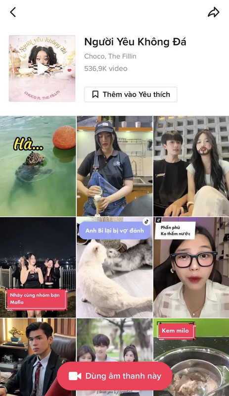 “Một đen đá không đường và một người yêu thương không đá em” là những giai điệu đang gây sốt trên TikTok thời gian qua khiến ai cũng không ngừng nhún nhảy. Được thể hiện qua giọng hát ngọt ngào của Choco, ca khúc “Người Yêu Không Đá” thể hiện đúng tinh thần của Gen Z với những mong muốn đầy phá cách của các cô nàng khi yêu khiến bao chàng trai phải đổ gục. Bài hát đã tạo nên hàng loạt điệu nhảy dễ thương khi kết hợp cùng hiệu ứng”Macbook Heart”, thu hút hơn 343 triệu lượt xem và 537 nghìn lượt video tham gia và hiện vẫn chưa có dấu hiệu hạ nhiệt trên đường đua âm nhạc TikTok.