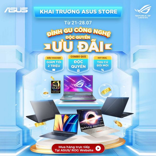 ASUS Việt Nam ra mắt trang mua hàng chính hãng trực tuyến ASUS Store ngay trên website chính thức của ASUS từ ngày 21-7-2022. Từ đây, khách hàng có thể mua sắm trực tuyến dải sản phẩm laptop ASUS/ROG cao cấp và đa dạng nhu cầu sử dụng như ASUS Zenbook dành cho giới văn phòng, ASUS Vivobook và ASUS TUF gaming dành riêng cho sinh viên, ASUS ROG laptop chuyên biệt cho game thủ. Thêm vào đó, những sản phẩm trên ASUS Store còn được ứng dụng công nghệ mới nhất hiện nay với chip Intel thế hệ thứ 12 và AMD Ryzen 7.