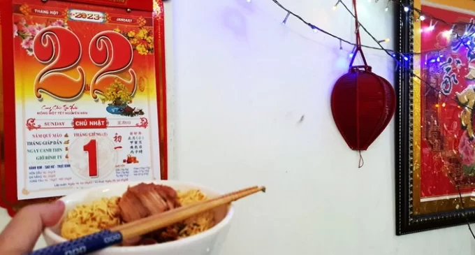 Mùng Một Tết nay 4.0 chuyển đổi số của A Phủ là một sự hybrid tổng hòa lấy bao tử là trung tâm với mì gói kết hợp với thịt kho trứng.