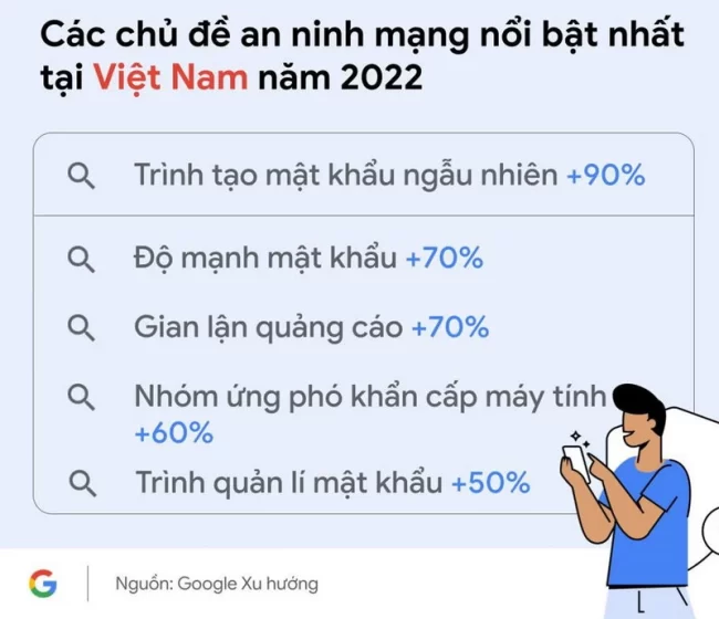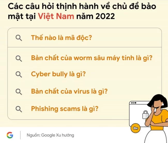 So với năm 2021, người dùng Internet Việt tìm kiếm nhiều hơn về các chủ đề liên quan đến an ninh mạng, như “Trình tạo mật khẩu ngẫu nhiên” tăng 90%, “Độ mạnh mật khẩu” hay “Gian lận quảng cáo” đều tăng 70%, và “Quản lý mật khẩu” tăng 50%. Người Việt cũng thể hiện sự quan tâm đáng kể đến mã độc, phần mềm độc hại và virus thông qua những câu hỏi như “Thế nào là mã độc?”, “Bản chất của worm sâu máy tính là gì?”, “Bản chất của virus là gì?”,…