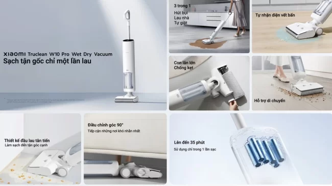 Với thiết kế không dây tiện lợi, Xiaomi Truclean W10 Wet Dry Vacuumđược mang lại trải nghiệm làm sạch hoàn hảo cho người dùng. Dòng sản phẩm có ba chức năng làm sạch chính bao gồm: hút bụi, lau nhà, tự giặt. Nhờ hệ thống phát hiện bụi bẩn thông minh, sản phẩm sở hữu tính năng cho phép thiết bị điều chỉnh công suất làm sạch tự động dựa vào lượng bụi đo được. Sản phẩm có khả năng dọn sạch những vết bẩn, bất kể đó là dạng chất lỏng hay lông thú cưng chỉ với một lần lau.