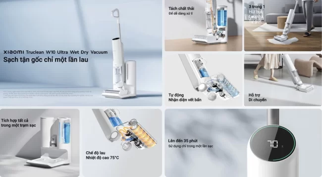 Với Truclean W10 Ultra Wet Dry Vacuum, Xiaomi trang bị chế độ lau nhiệt độ cao lên đến 75 độ C giúp người dùng làm sạch mọi vết bẩn một cách kỹ lưỡng hơn. Sản phẩm cũng tích hợp nhiều tính năng như khả năng tự động làm sạch, tự đổ đầy nước, tự động làm khô trong một trạm sạc thông minh.