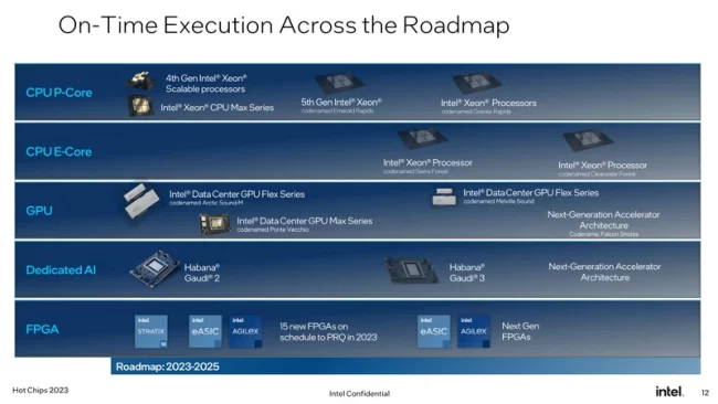 Intel cho biết: Lộ trình và các sản phẩm dành cho trung tâm dữ liệu của Intel đang đi theo đúng kế hoạch đã vạch ra để có thể cung cấp cho khách hàng đúng hạn. Các vi xử lý Intel Xeon thế hệ 5 (tên mã Emerald Rapids) đang được cung cấp mẫu cho các khách hàng và dự kiến sẽ ra mắt đúng hẹn vào quý 4-2023. Các vi xử lý Intel Xeon với nhân E-core (Sierra Forest) dự kiến sẽ đến tay doanh nghiệp trong nửa đầu năm 2024. Các vi xử lý Intel Xeon với nhân P-core (Granite Rapids) cũng sẽ ra mắt một thời gian ngắn sau đó. Các mạch tích hợp Intel Agilex 9 Direct RF FPGA đã được chuyển đến các hệ thống của BAE trước 6 quý so với kế hoạch đã đề ra. Điều này cho thấy khả năng của Intel trong việc cung ứng các tính năng đầu ngành nhanh chóng thông qua việc tích hợp không đồng nhất dựa trên mạch chiplet (chiplet-based heterogeneous integration) với công nghệ cầu liên kết đa die tích hợp (embedded multi-die interconnect bridge, EMIB) của Intel.