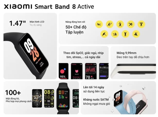 Nhằm đáp ứng nhu cầu trải nghiệm của người dùng, Xiaomi còn cho ra mắt một phiên bản rút gọn của Xiaomi Smart Band 8 mang tên Xiaomi Smart Band 8 Active. Xiaomi Smart Band 8 Active có màn hình LCD 1.57 inch, thiết kế mỏng 9,99mm mang đến cảm giác dễ chịu khi sử dụng, thời lượng pin lên đến 14 ngày, kháng nước 5ATM, được cài đặt sẵn hơn 50 chế độ tập luyện và hàng loạt tính năng theo dõi sức khỏe như SpO2, giấc ngủ, nhịp tim, căng thẳng,…